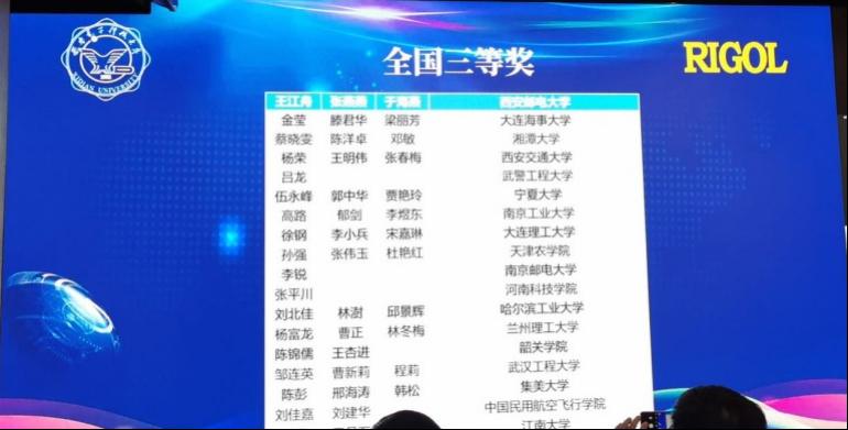 本次竞赛由教育部高等学校电子信息类专业教学指导委员会与国家级实验教学示范中心联席会电子学科组主办,西安电子科技大学和西安电子科技大学出版社承办。本次“RIGOL”杯竞赛采取自愿报名、全国复赛的模式,来自西安交通大学、复旦大学、北京邮电大学、哈尔滨工业大学、电子科技大学、北京航空航天大学、西北工业大学等全国百余所高校参加361个案例的复赛角逐,最终评选出全国一等奖38项(其中包括“RIGOL杯”一项、“最佳创意奖”三项、“最佳工程奖”两项)、二等奖65项、三等奖72项。