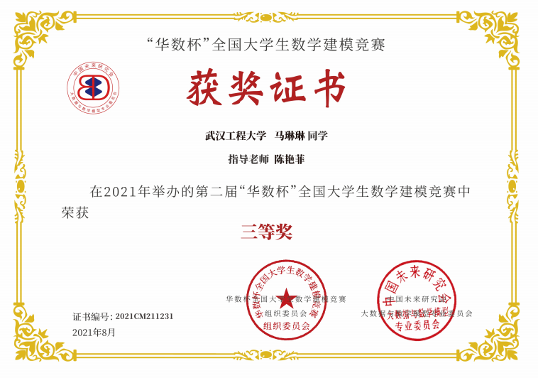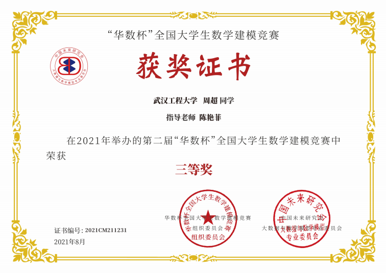 本网讯(通讯员 黄光亮)8月25日,由华数杯全国大学生数学建模竞赛组委会、中国未来研究会大数据与数据模型专业委员会主办的第二届“华数杯”全国大学生数学建模竞赛公布成绩。由电气信息学院研究生黄钰量、周超、光能数理学院马琳琳组成的团队在该项比赛中荣获全国三等奖。