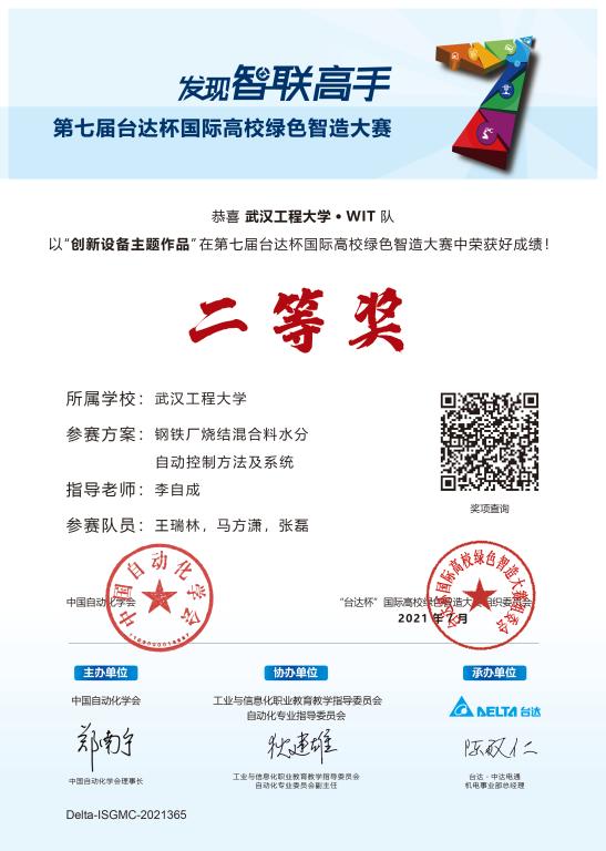 本网讯(通讯员 任伟)7月24日-25日,由中国自动化学会主办,台达集团承办的自动化领域的绿色创新型科技竞赛—第七届“台达杯”国际高校绿色智造大赛圆满落幕。我校电气信息学院王瑞林、马方潇、张磊三位同学组成的“WIT队”(参赛作品:钢铁厂烧结混合料水分自动控制方法及系统)在大赛总决赛中荣获二等奖。