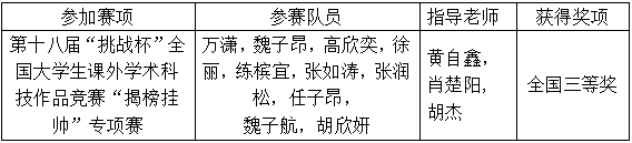 本网讯(通讯员 林梦颖 万潇 魏子昂)由共青团中央、中国科协、教育部、中国社会科学院、全国学联以及贵州省人民政府主办,贵州大学承办的第十八届“挑战杯”全国大学生课外学术科技作品竞赛“揭榜挂帅”专项赛终审环节圆满落幕,我校电气信息学院学子在本届大赛中荣获国家级三等奖。