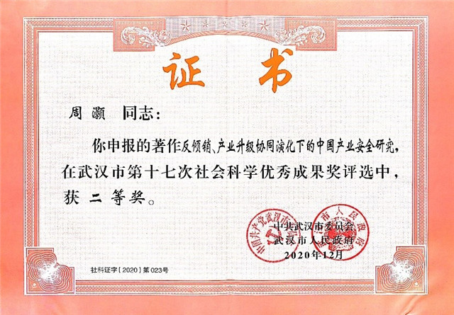 武汉市委办公厅、市政府办公厅发布了《关于武汉市第十七次社会科学优秀成果的通报》(武办文[2020]60号),公布了本界获奖名单。4月16日武汉市社会科学联合会在武汉会议中心举行了获奖成果颁奖表彰大会,周灏教授受邀作为获奖代表上台领奖。本次获奖成果是周灏教授主持并完成的国家社会科学基金重点项目的研究成果,这说明获奖者在贸易摩擦和产业安全方面的研究得到了学术界和社会的广泛认同。(审稿 黄艳)