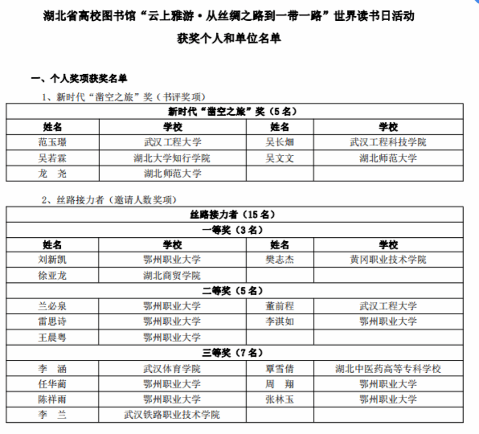 本网讯(通讯员 杨茜 范玉璟)近日,由湖北省高等学校图书情报工作委员会主办,湖北省高等学校图书情报工作委员会阅读推广专业委员会承办的湖北省高校图书馆“云上雅游·从丝绸之路到一带一路”世界读书日活动评选结果出炉。我校继续教育学院董前程同学荣获“丝路接力者”二等奖,图书馆范玉璟老师获得“新时代凿空之旅”书评一等奖,图书馆杨茜老师获得优秀指导老师奖,我校图书馆荣获优秀组织单位奖。