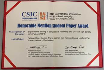 学院代表参加了结构完整性评估、蠕变腐蚀等展厅会议研讨,介绍了机电工程学院在结构完整性领域取得的优秀成果。硕士生丁珮珊以“高密度聚乙烯(HDPE)压缩棘轮蠕变试验研究”为题参加了学生竞赛,并荣获“最佳学生论文提名奖”。