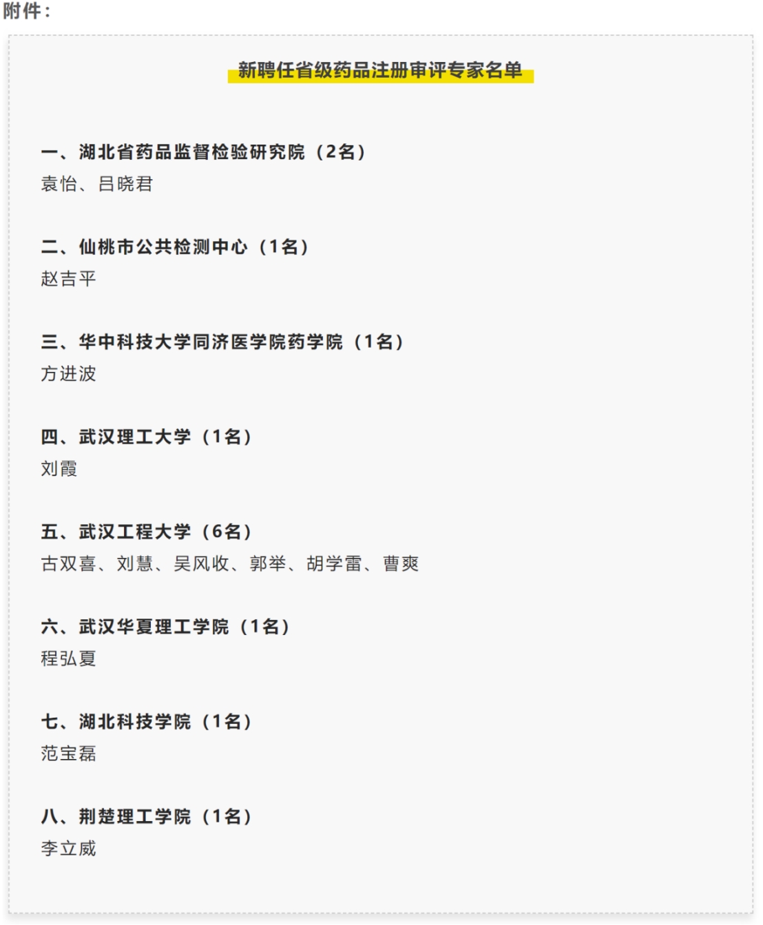 本网讯(通讯员 张双双)12月26日,湖北省药品监督管理局发布了“省药品监督管理局关于公布新聘任省级药品注册审评专家的通知(鄂药监函〔2024〕129号 )”,我校化工与制药学院制药系古双喜教授、胡学雷教授、吴风收教授、刘慧副教授、郭举副教授、曹爽副教授等6名教师入选省级药品注册审评专家。在此轮评选中,全省共有14名专家入选,我校入选人数最多。