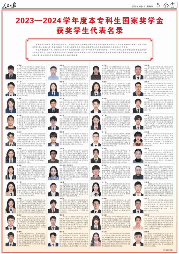 本网讯(通讯员 曾峥 汤曦)5月4日,《人民日报》专版刊登《2023—2024学年度本专科生国家奖学金获奖学生代表名录》,展示了100名本专科生国家奖学金获奖学生代表风采。我校化工与制药学院2021级学生宫咪雪从全国12万本专科生国家奖学金获得者中脱颖而出,入选名录。