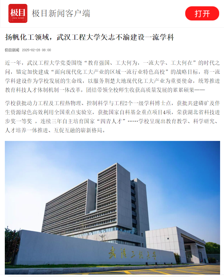 学校获批动力工程及工程热物理、控制科学与工程2个一级学科博士点,获批共建磷矿及其共伴生资源绿色高效开发利用全国重点实验室,获批国家自科基金重点项目4项,荣获湖北省科技进步奖一等奖 ,连续三年自主培育国家“四青人才”……学校呈现出教育教学、科学研究、人才培养一体推进、互促互融的崭新格局。