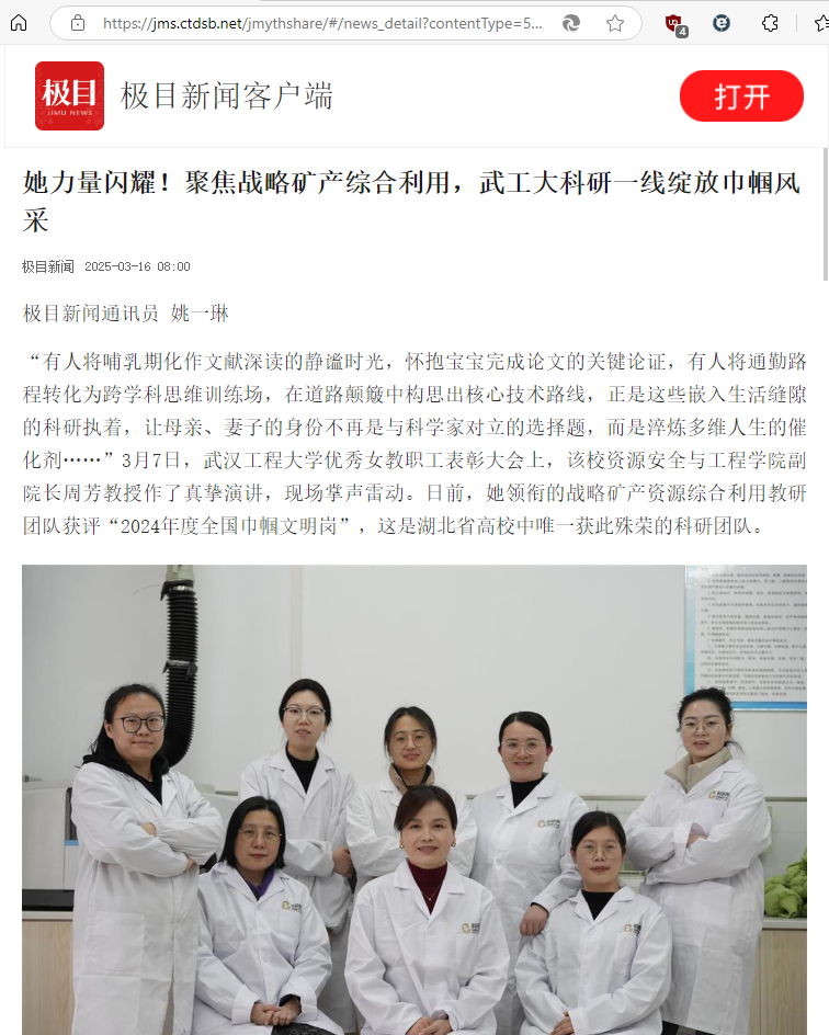 “科学没有‘她’或‘他’,只有‘我们’。”周芳说,团队将继续以国家需求为导向,以科技创新为动力,以人才培养为核心,不断深化学科交叉融合,攻克更多关键核心技术,为国家矿产资源产业绿色低碳转型升级、为长江经济带高质量发展、湖北省“支点建设”贡献智慧和力量。