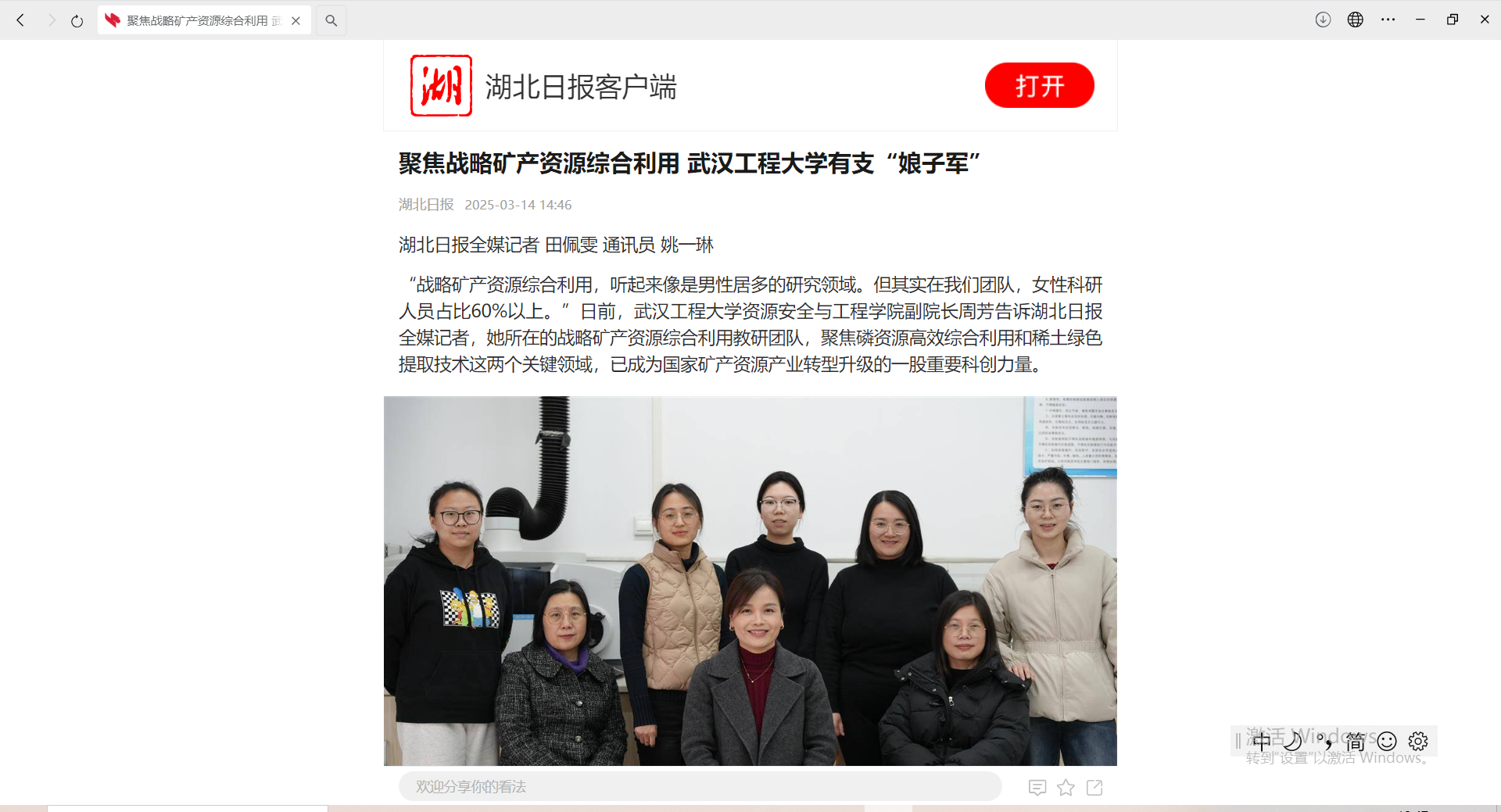 “战略矿产资源综合利用,听起来像是男性居多的研究领域。但其实在我们团队,女性科研人员占比60%以上。”日前,尊龙凯时人生就是博资源安全与工程学院副院长周芳告诉湖北日报全媒记者,她所在的战略矿产资源综合利用教研团队,聚焦磷资源高效综合利用和稀土绿色提取技术这两个关键领域,已成为国家矿产资源产业转型升级的一股重要科创力量。
