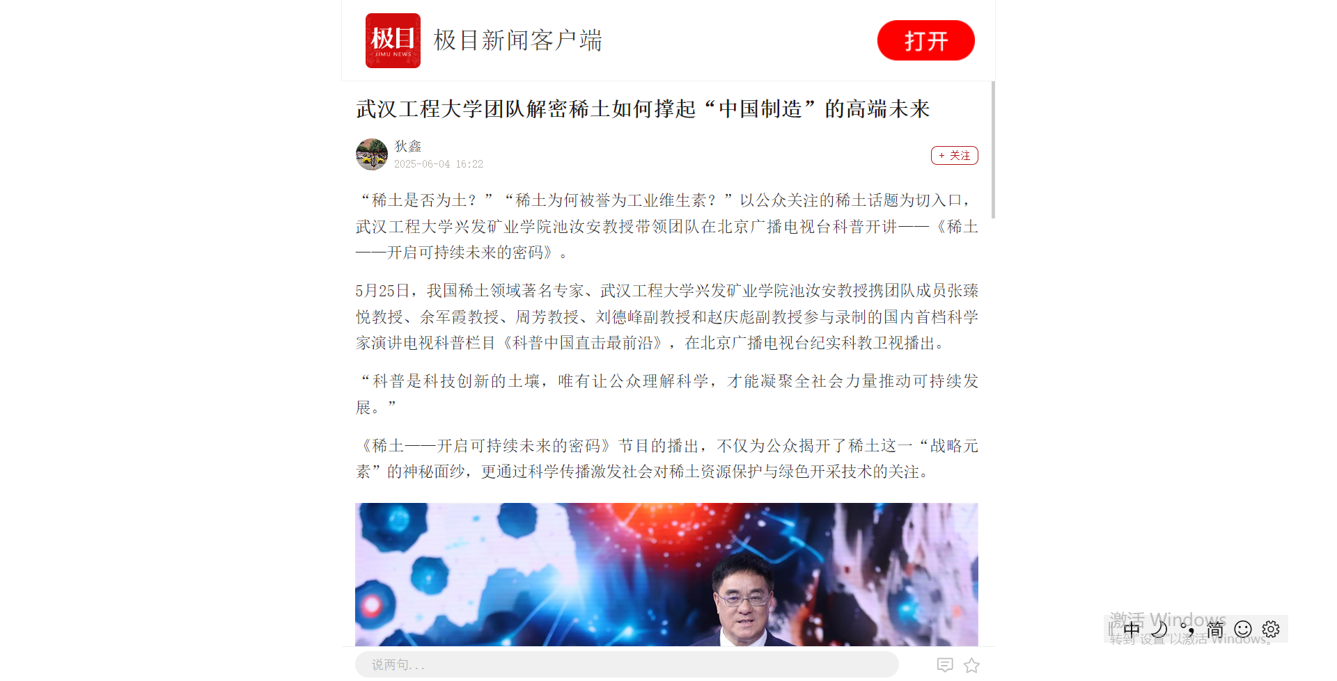《稀土——开启可持续未来的密码》节目的播出,不仅为公众揭开了稀土这一“战略元素”的神秘面纱,更通过科学传播激发社会对稀土资源保护与绿色开采技术的关注。