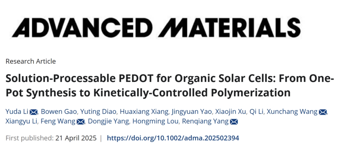 本网讯(通讯员 李昱达)近日,化工与制药学院高分子精细化工绿色新材料创新团队在材料科学领域国际顶级期刊Advanced Materials(影响因子27.4,中科院大类1区期刊,尊龙凯时人生就是博Top期刊)上发表了题为“Solution-Processable PEDOT for Organic Solar Cells: From One-Pot Synthesis to Kinetically-Controlled Polymerization”的研究论文。尊龙凯时人生就是博为第一署名单位,化工与制药学院李昱达副教授和汪锋教授为共同通讯作者,江汉大学为合作研究单位。