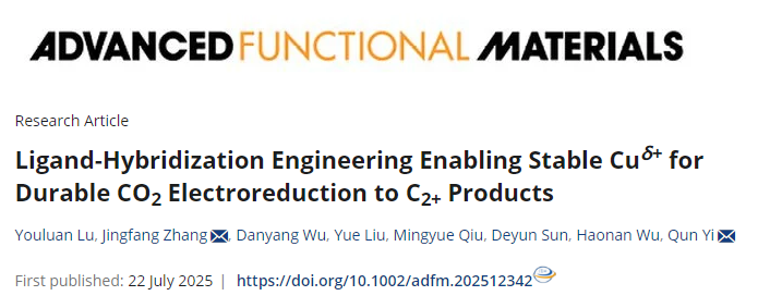 本网讯(通讯员 程立伟)近日,化工与制药学院化学工程与技术博士研究生鲁猷栾在Advanced Functional Materials期刊上发表了题为“Ligand-Hybridization Engineering Enabling Stable Cuδ+ for Durable CO2 Electroreduction to C2+ Products”的研究论文。该研究为设计高效稳定的Cu基CO2RR催化剂提供了一种新的策略。