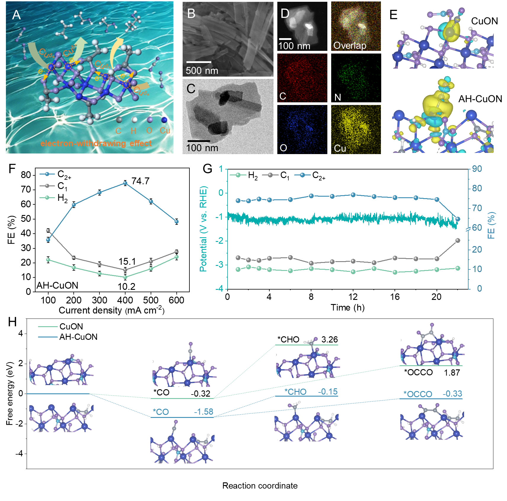 电催化二氧化碳还原反应(CO2RR)提供了一种利用可再生电能将CO2转化为高值多碳(C2+)化学品的可持续途径。铜(Cu)被认为是一种很有前途的生成C2+化学品的催化剂,但其法拉第效率(FE)较低,稳定性较差。该研究通过乙酸配体部分取代羟基或硝酸根策略精确调节Cu2(OH)3NO3(CuON)上Cu位点的配位环境,促进了Cu位点和乙酸配体之间的电子离域,诱导活性Cuδ+物质的形成,提高了物质稳定性,从而促进高效稳定的C-C偶联反应并选择性地生成C2+产物。催化剂(AH-CuON)在400 mA/cm2的高电流密度下,对C2+产物的FE高达74.7%。