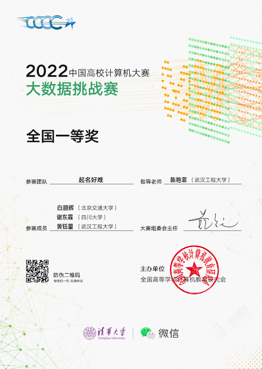 本网讯(通讯员 黄光亮 黄钰量)8月3日至5日,由清华大学和腾讯联合举办的中国高校计算机大赛——微信大数据挑战赛圆满闭幕,电气信息学院2020级研究生黄钰量所在团队荣获大赛全国一等奖。2022中国高校计算机大赛——微信大数据挑战赛(以下简称“大赛”)由清华大学和腾讯微信事业群联合举办,由腾讯云提供大赛资源支持。本次大赛是以企业真实场景和实际脱敏数据为基础、面向全球开放的高端算法竞赛,吸引了海内外4331人报名...