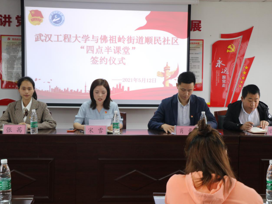 本网讯(通讯员 张茜)5月12日上午,校团委和江夏区佛祖岭街道办事处顺民社区居民委员会联合举办的“四点半课堂”签约仪式在顺民社区居民委员会会议室顺利举行。顺民社区居民委员会党支部副书记宋雪代表社区对我校志愿者工作表示高度的认可和感谢,希望在未来的合作中,双方加强交流、通力合作,将“四点半课堂”活动持续长久地推广下去。校团委副书记肖豪对顺民社区居民委员会的信任与支持表示了真挚的感谢...