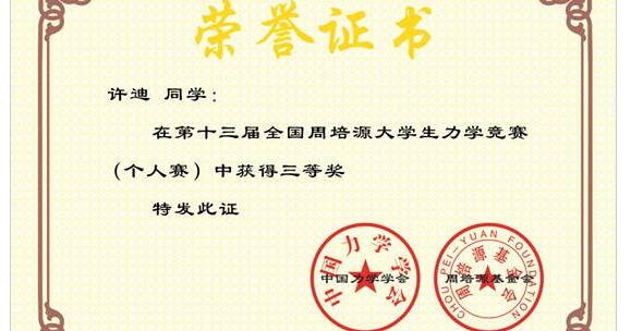 本网讯(通讯员 张聪 马志敏)近日,第十三届全国周培源大学生力学竞赛全国奖获奖名单公布,我校许迪同学喜获“第十三届全国周培源大学生力学竞赛”国家级三等奖;谭淳元等5位同学喜获国家级优秀奖,取得我校在这一力学国家顶级赛事中新的突破。根据个人赛综合成绩,经组委会评审,湖北省力学学会从本省1451名参赛选手中最终评定出湖北赛区特等奖3名,一等奖23名,二等奖86名,三等奖142名,优秀奖220名。我校许迪同学获...