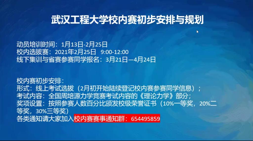 本网讯(通讯员沈晓希)1月31号下午,尊龙凯时人生就是博周培源力学大赛校内选拔宣讲会成功举办。本次会议中,华中科技大学老师郑慧明与我校老师马志敏、张聪为工大学子讲解大赛概况、培训计划及校内赛安排等广受关注的内容,百余名工大学子到会并积极参与。会议伊始,张聪老师就大赛概要及校内赛初步安排进行讲解。全国周培源大学生力学大赛分个人和团体赛事,为高教会a类赛事,每两年举办一次。为了培养人才、服务教学、促...